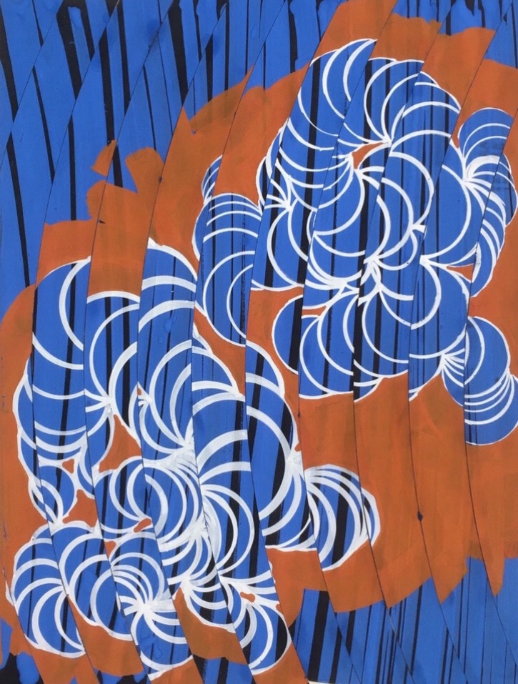 This painting was created by layering geometric styles on top of one another, then cutting the paper and reassembling the abstract patterns.