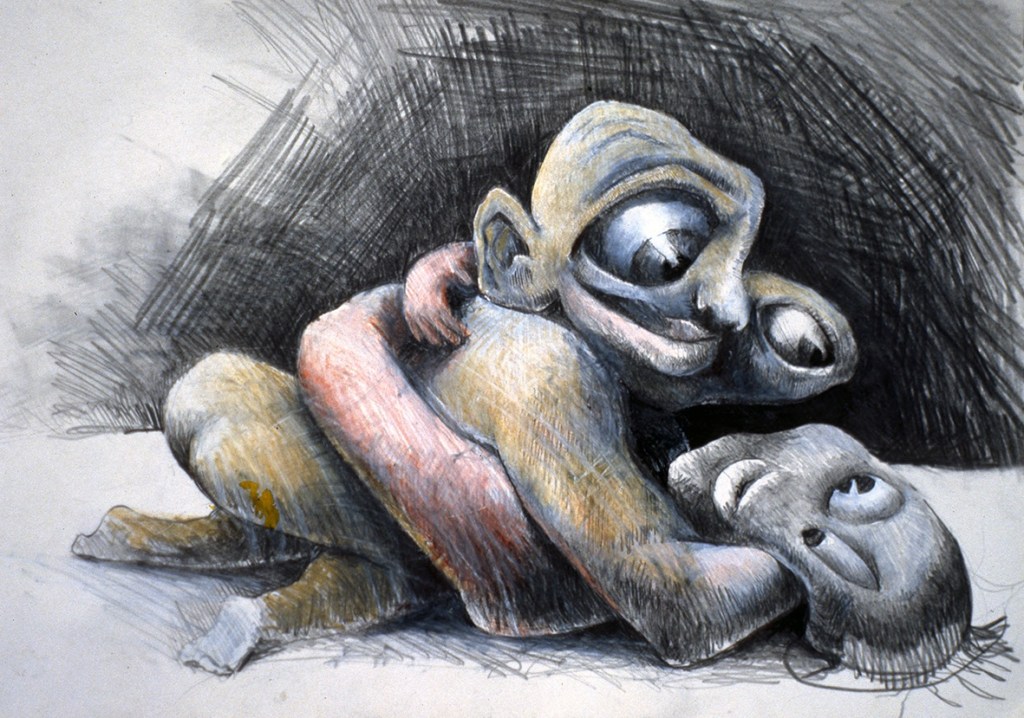 The work is mostly figurative, drawn from life. I stretched and distorted anatomy—arms, legs, heads—as expressive tools.