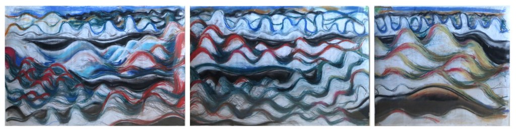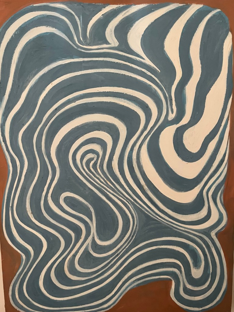 Now, in the Scotts Church basement, I revisited the idea with paint. Each line was guided by instinct—responding, diverging, flowing—within the limits of the canvas. The process balanced repetition and improvisation.